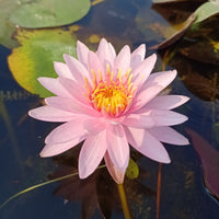 This water lily was named by the International Waterlily and Water Gardening Society (IWGS) as The 2013 Collector's Aquatic Plant of the Year. It has uniquely variegated blooms of pink and white and beautiful bronze hued leaves. This water lily was hybridised by Slocum.