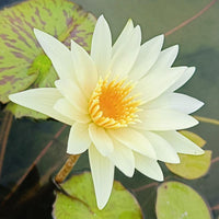 Introducing the exquisite and fragrant Bianca Castillo water lily, a captivating addition to any water garden. Its creamy white petals, delicately unfurling around a vibrant golden-orange heart, exude an ethereal beauty that will transform your pond into a tranquil oasis.