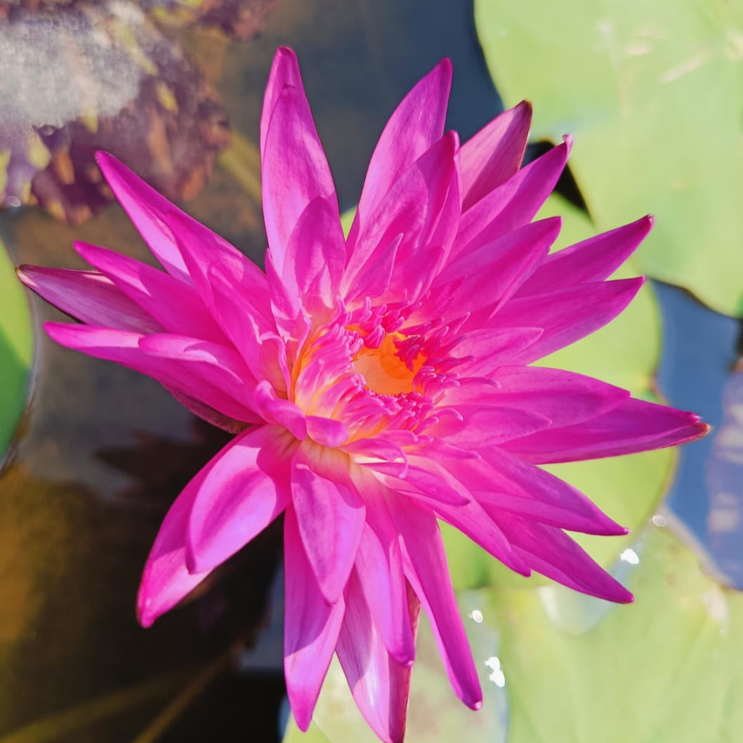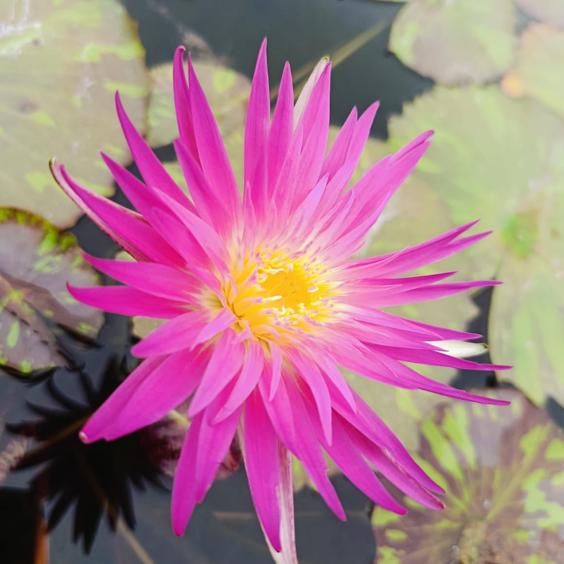 Bring a vibrant piece of Miami Rose to your home with the breathtaking Like Miami Rose water lily. This stunning cultivar boasts a profusion of intensely fuchsia-pink petals, radiating outwards from a captivating golden-yellow center. Its numerous, slender petals create a captivating, almost starburst effect, making it a truly unforgettable addition to any water garden. The seedling found in our pond, which resembles a Miami Rose, was named "Like Miami Rose."