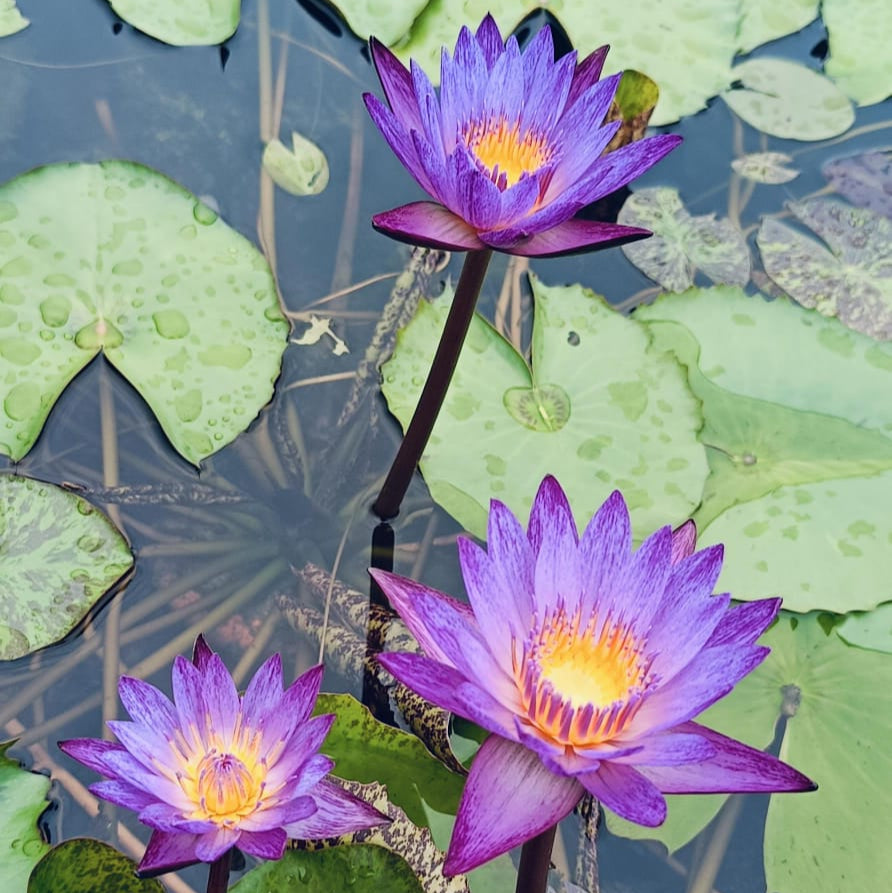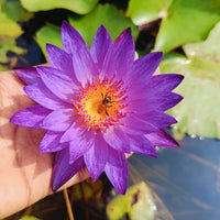 Bring a touch of enchantment to your garden with the Lindsey Woods purple water lily hybridised by Rolf Nelson in the year 2000. This tropical beauty thrives in India's warm climate, displaying intense deep purple blooms with uniquely mottled leaves and a strong fragrance. It's a prolific bloomer, perfectly suited for ponds of all sizes.