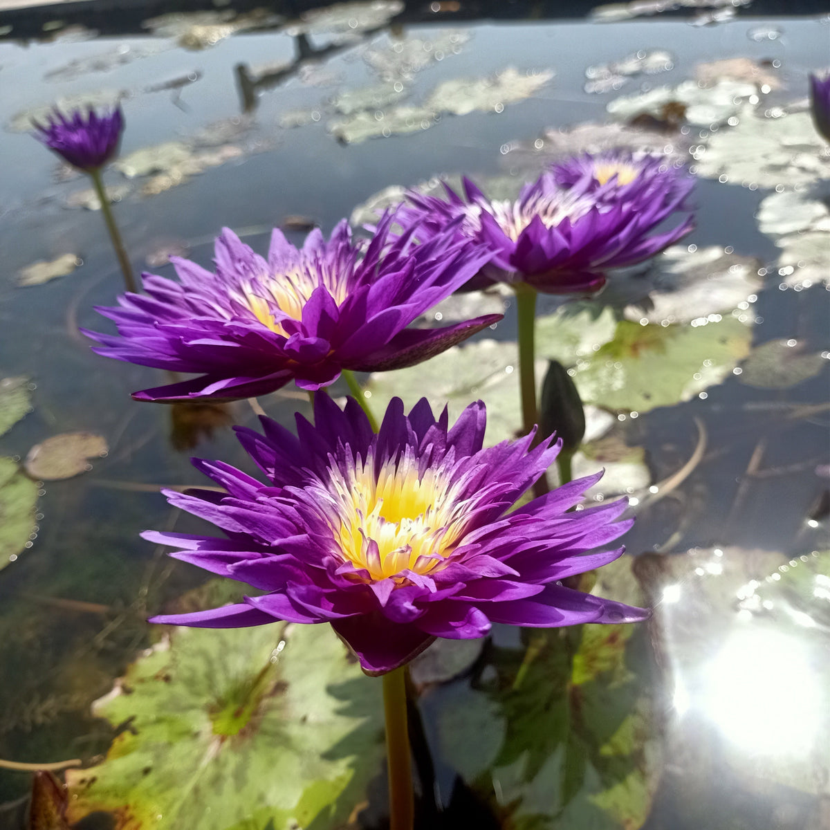 Behold the breathtaking Plum Crazy Water Lily, a cultivar renowned for its intensely vibrant purple blooms and captivating contrast. This stunning aquatic plant isn't just a pretty face; it’s a captivating addition to any water garden, bringing a touch of exotic beauty to your landscape. Plum Crazy is a hybrid from Florida Aquatic Nursery n the year 2013. Its deep purple petals, delicately edged with a lighter shade, create a mesmerizing effect, accented by a bright yellow center encircled by creamy-white stamens.
