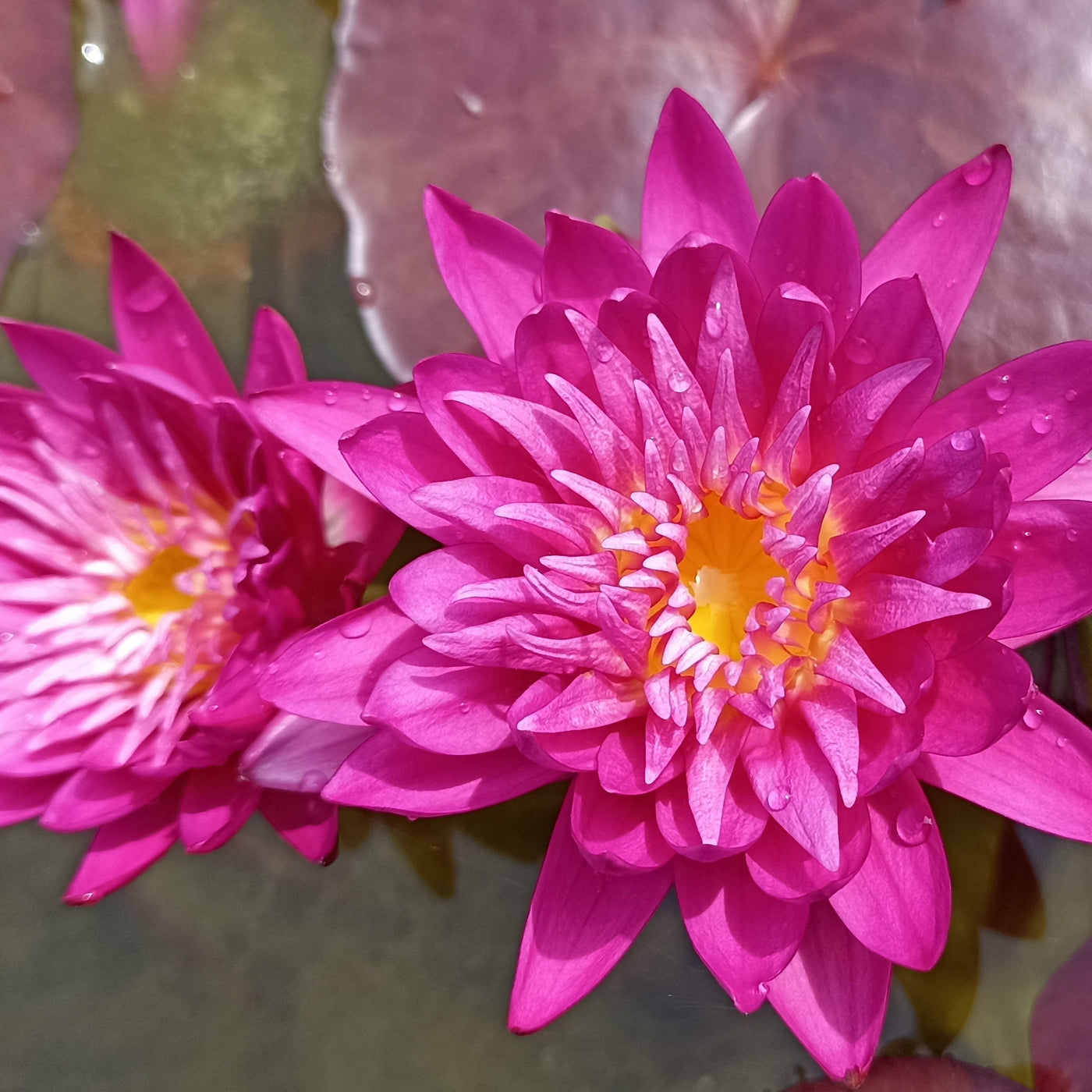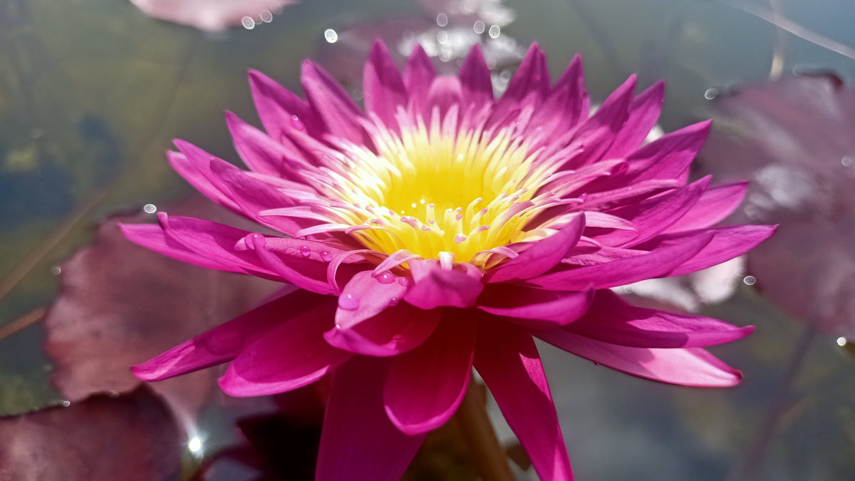 Behold the breathtaking Red Fire Work Water Lily, a captivating aquatic marvel that will transform your pond or water feature into a vibrant spectacle. This stunning cultivar boasts a rich, crimson-pink exterior that gracefully transitions to a radiant, sunny yellow heart, creating a mesmerizing contrast. Each petal is delicately formed, showcasing the intricate beauty of nature's artistry. Water droplets clinging to the petals after a rain shower only enhance its allure.