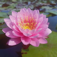 A reliable bloomer that seldom disappoints.Its captivating pink petals surround a striking golden-yellow center. This stunning hybrid is known for its exceptional blooms. Notice the delicate water droplets clinging to the petals – a testament to its lush texture. This hardy water lily was hybridised by Slocum in the year 1987.